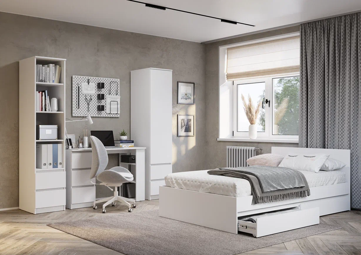 Шкаф-пенал с просторными полками поможет организовать учебники и книги, а шкаф с выдвижными ящиками и штангой для одежды поддержит порядок в гардеробе. Широкая кровать с нишами создаст место для отдыха и хранения игрушек, а письменный стол с выдвижными ящиками обеспечит удобное пространство для выполнения домашнего задания и хранения мелочей.