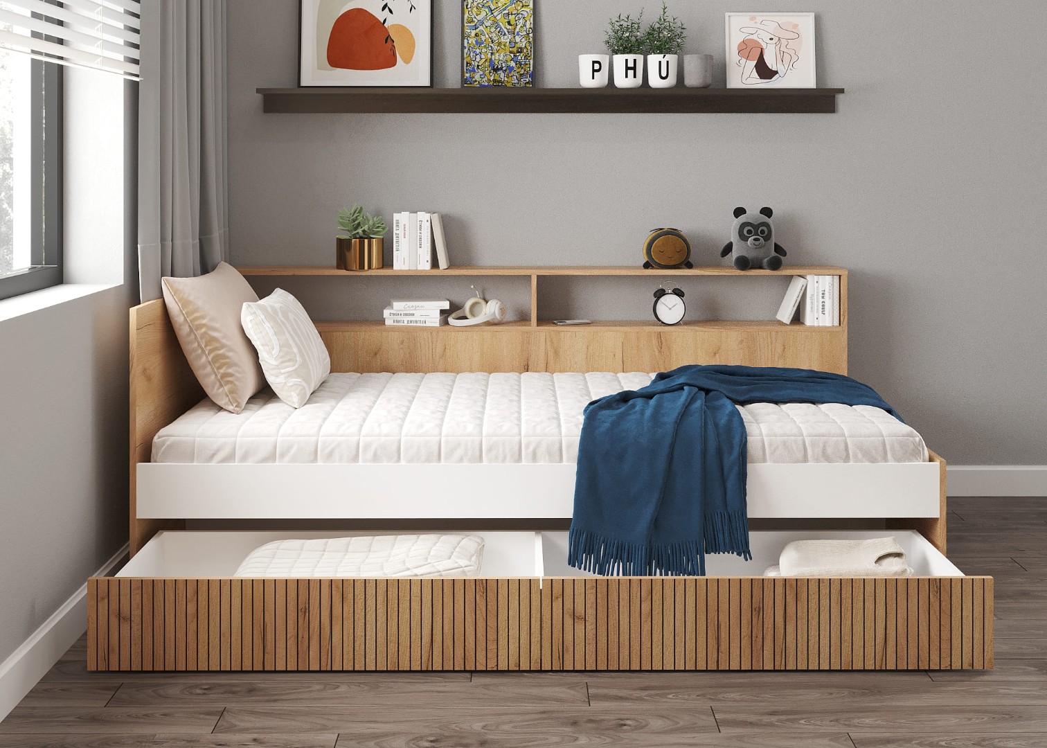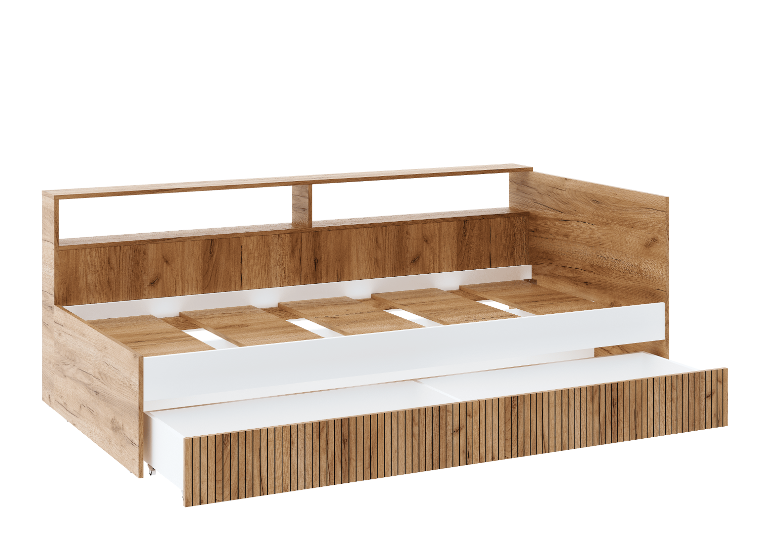 Кровать детская "Ивис" - функциональный и стильный выбор для Вашей детской либо подростковой комнаты. Включает в себя просторное однопальное место, необходимое для качественнного сна, выдвижные ящики для хранения постельного белья, а также открытые полки, где Вы сможете разместить книги либо предметы декора. Фотопечать, имитирующая вертикальную фрезеровку на фасаде, придаст комнате атмосферу уникальности. Цветовое сочетание "Дуб Крафт золотой" и "Белый" визуально расширит пространство и создаст ощущение тепла и уюта.