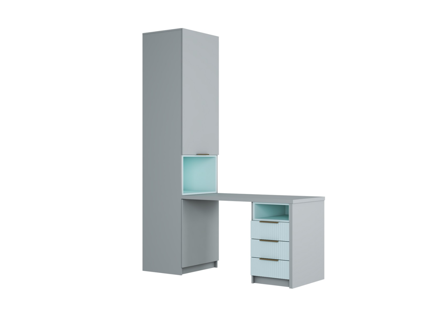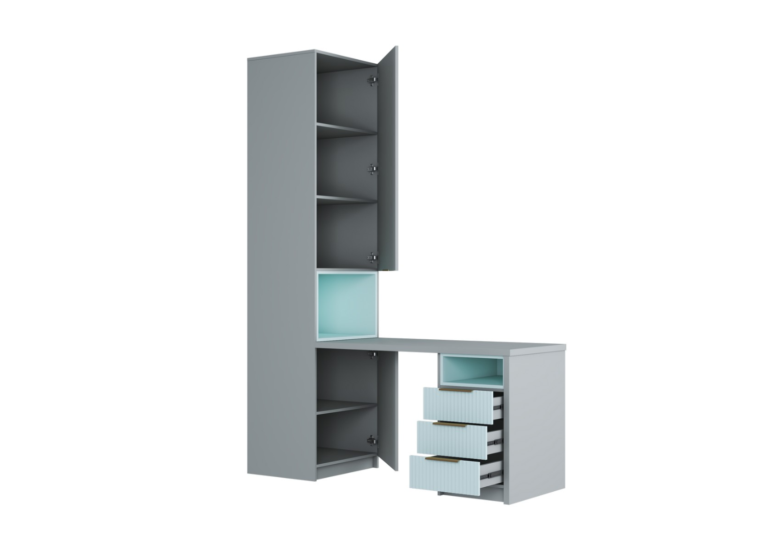 Угловой письменный стол "Джерси" со шкафом и выдвижными ящиками на шариковых направляющих полного выдвижения предоставляет комфортное и функциональное рабочее место для детей, где они могут заниматься учебой, рисовать или играть в игры.