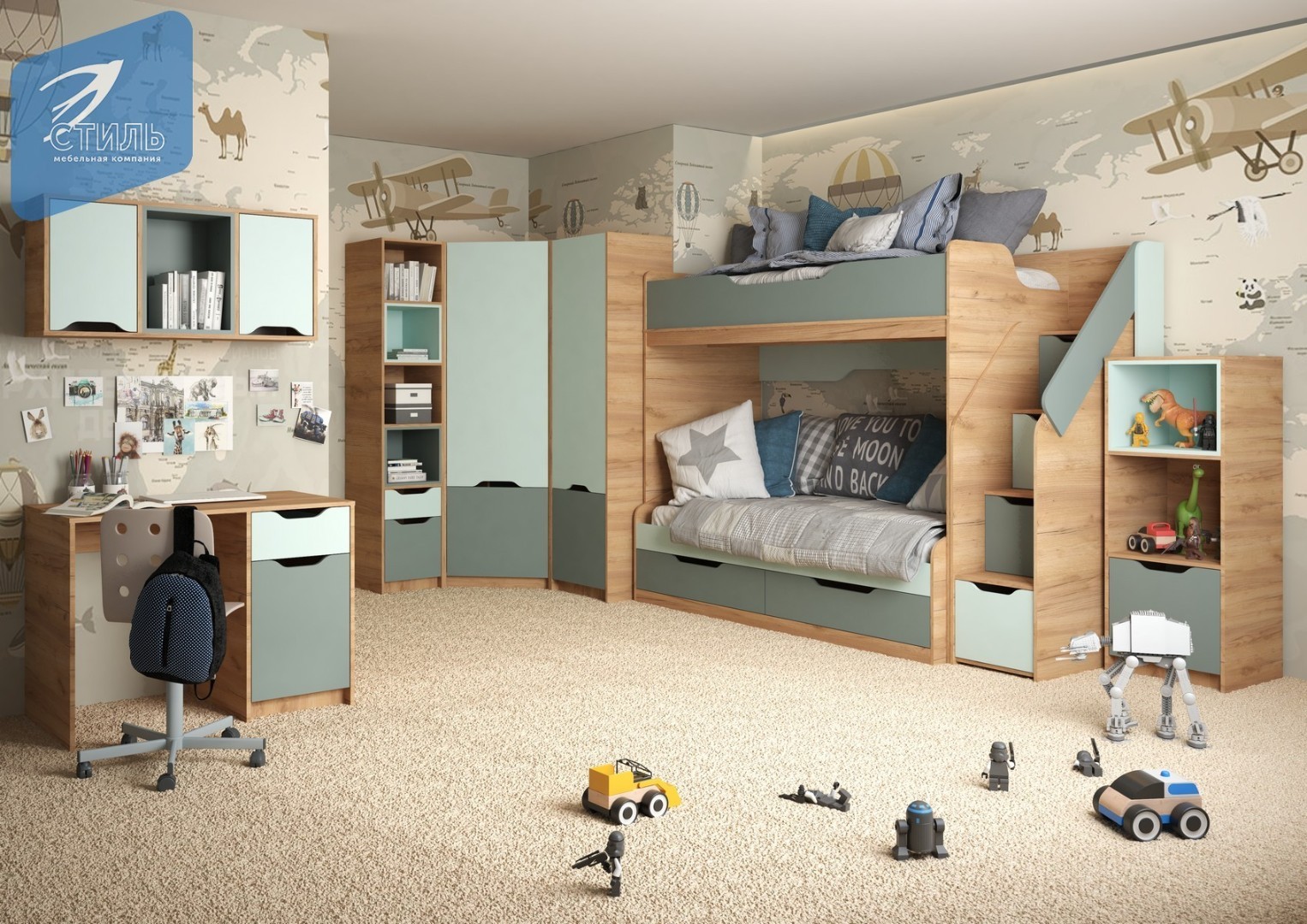 Проект разработан с применением безопасных и экологичных материалов, а также рассчитана надежная и безопасная конструкция. Стол можно установить под кровать-чердак из этой же коллекции.