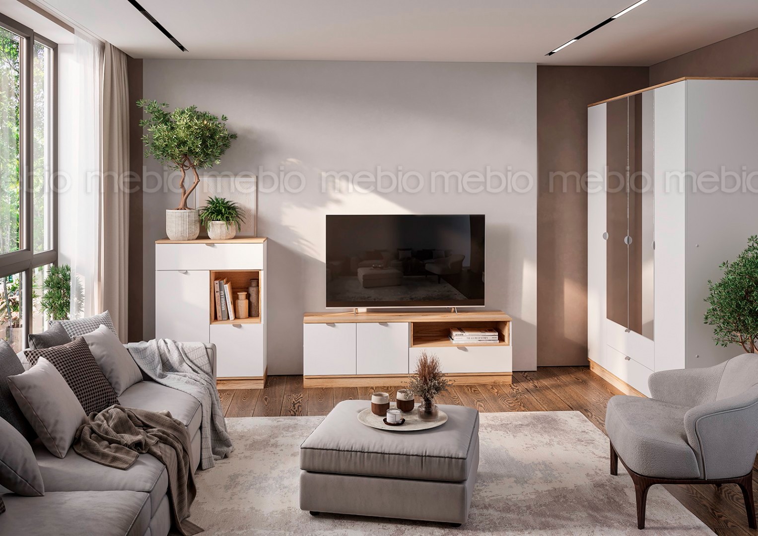 Модульная гостиная «Юкки» в сдержанном скандинавском стиле включает все самое необходимое для обустройства функционального интерьера: вместительный четырехстворчатый шкаф с зеркалом, высокий комод для хранения личных вещей, тумбу под телевизор и настенную полку для предметов декора. Комплект выполнен в спокойных, нейтральных оттенках, что создает в помещении атмосферу гармонии и уюта.