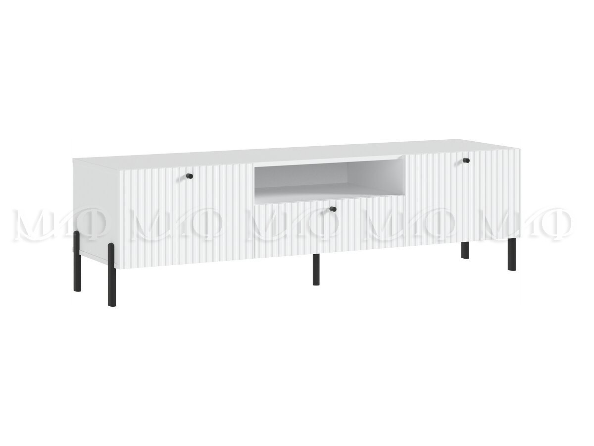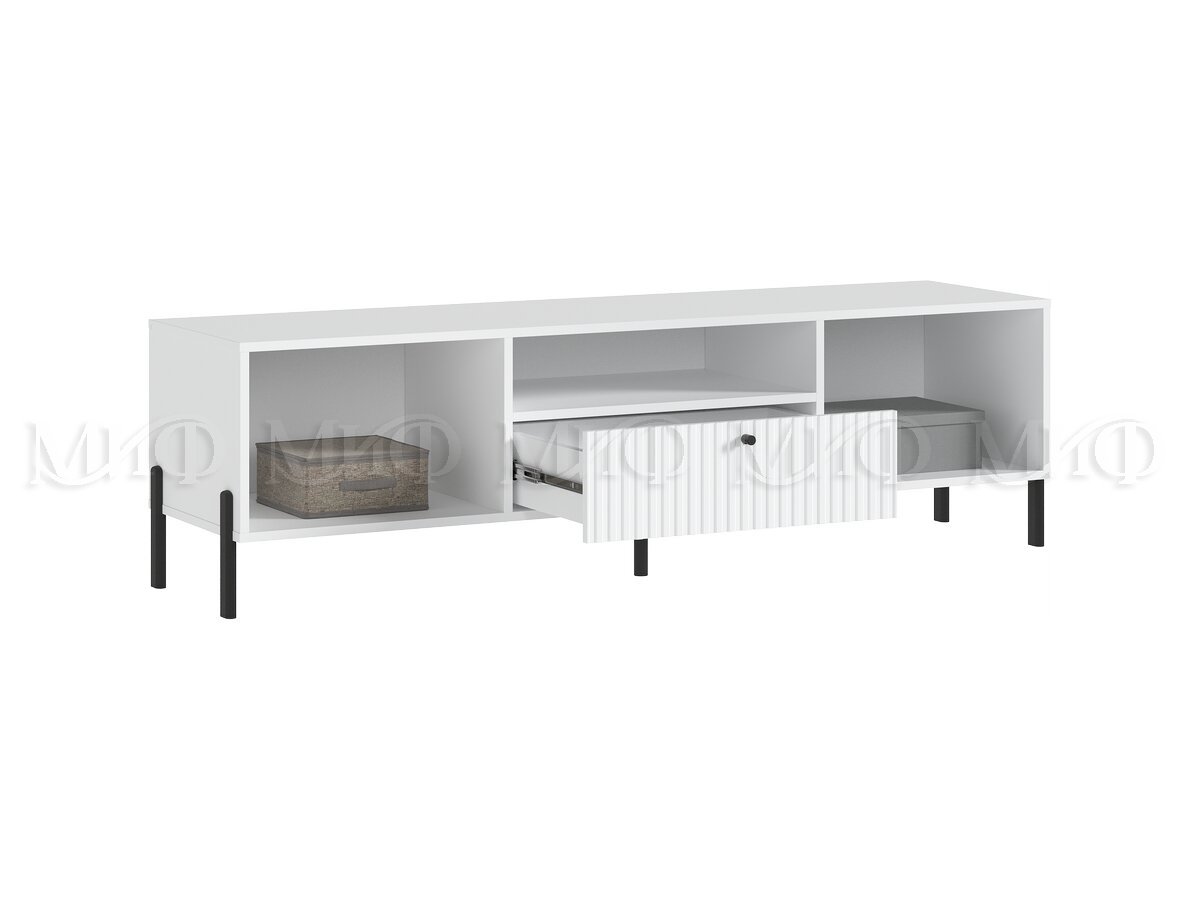 Тумба малая «Оливия» под телевизор – компактный и функциональный модуль для гостиной. Наполнение тумбы представлено открытой и двумя закрытыми нишами, а также неглубоким выдвижным ящиком. Изысканный вид придают изделию белые глянцевые фасады с фрезеровкой, а надёжные металлические опоры подчеркнут графичность изделия.