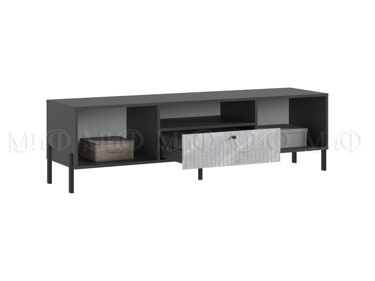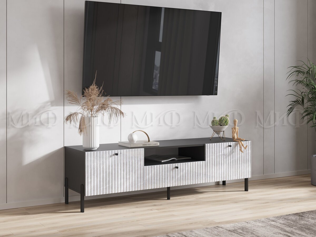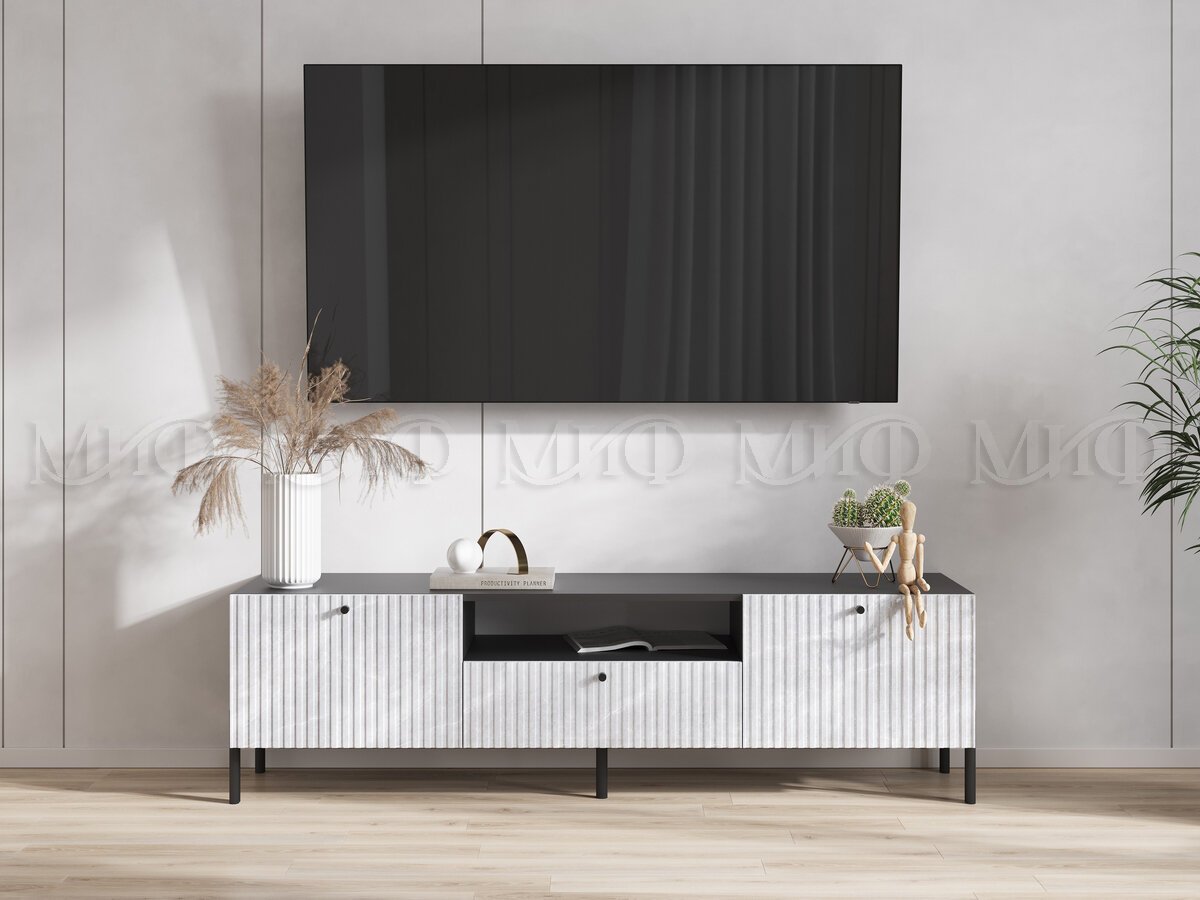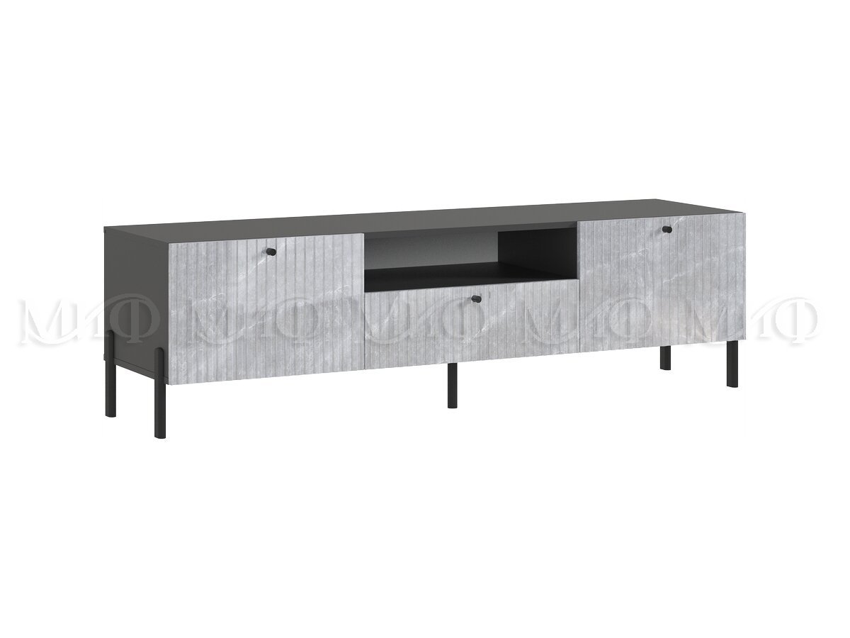 Тумба малая «Оливия» под телевизор – компактный и функциональный модуль для гостиной. Наполнение тумбы представлено открытой и двумя закрытыми нишами, а также неглубоким выдвижным ящиком. Изысканный вид придают изделию мраморные глянцевые фасады с фрезеровкой, а надёжные металлические опоры подчеркнут графичность изделия.