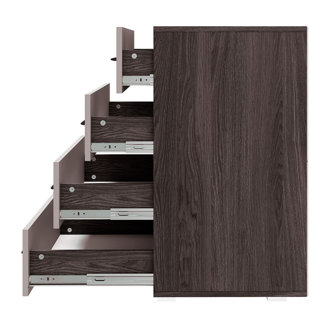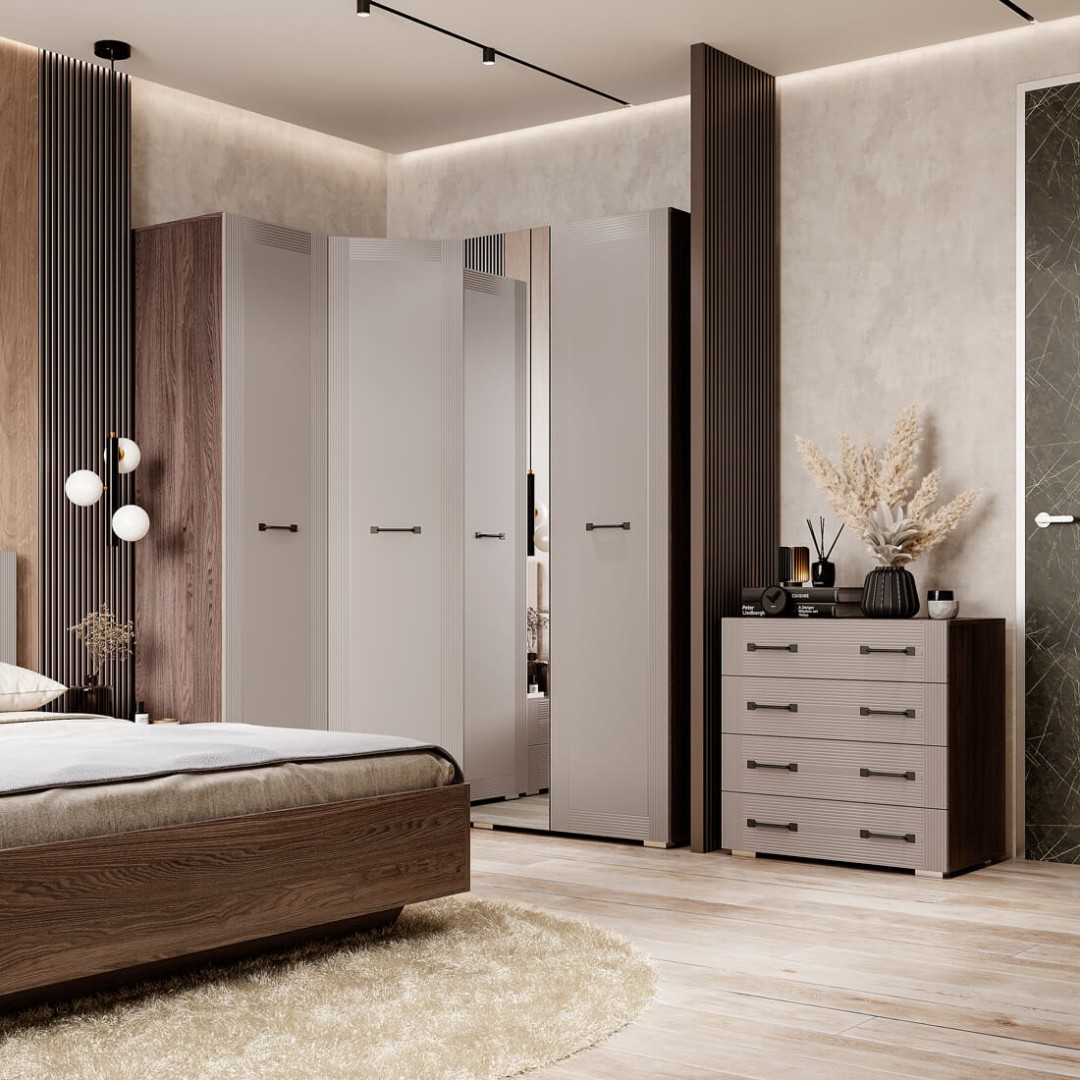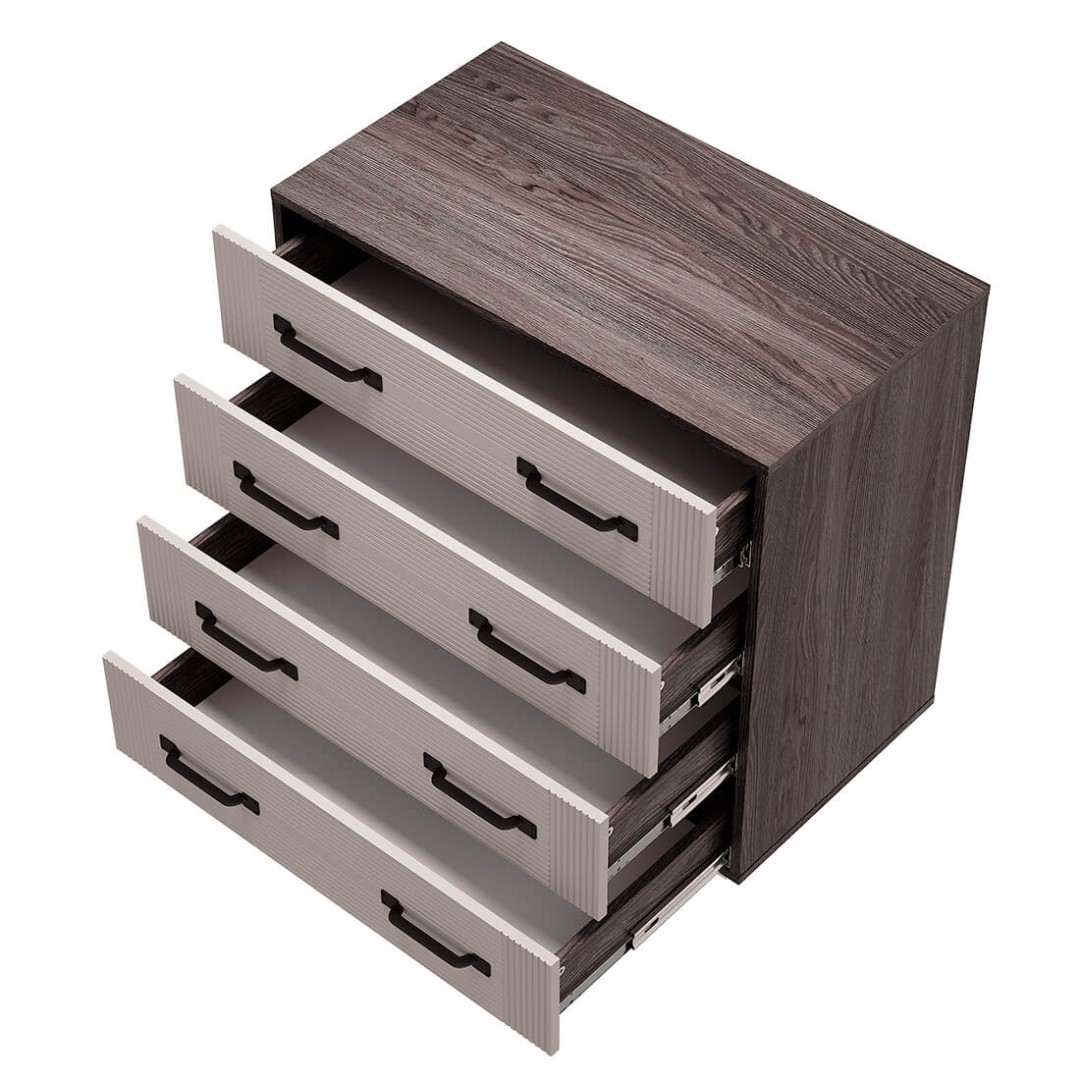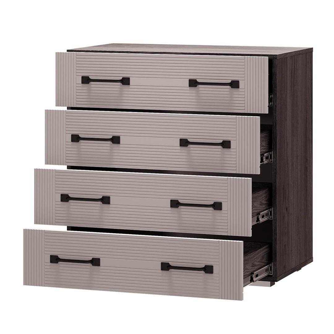 Комод Моника – гармоничное сочетание практичности и эстетичного внешнего вида. Изделие состоит из четырех вместительных выдвижных ящиков на шариковых направляющих, обеспечивающих легкую и бесшумную эксплуатацию модели. Спокойный, неяркий цвет фасадов в тандеме с корпусом насыщенного темно-шоколадного оттенка смотрится необычайно эффектно и создает в помещении атмосферу тепла и домашнего уюта.