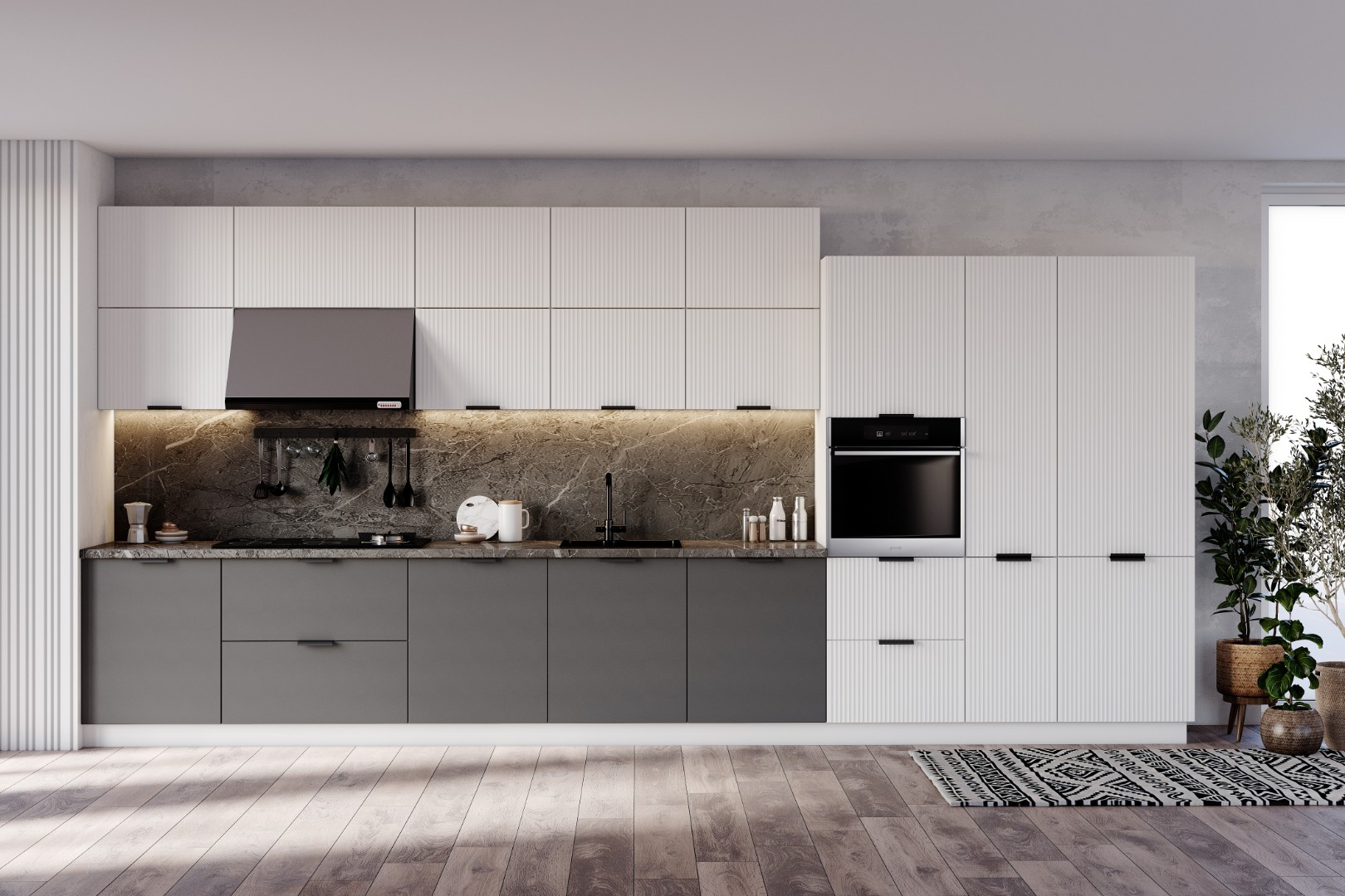 Кухня «Монца/Ройс» - гармоничный дуэт двух модульных систем: изысканной линейки «Монца» с эффектной вертикальной фрезеровкой на фасадах и минималистичной коллекции «Ройс» с лаконичным дизайном фасадов. Модели органично дополняют друг друга, образуя целостную композицию. Выбор такого гарнитура для обустройства кухонного пространства подчеркнет тонкий вкус и безупречное чувство стиля хозяев дома.