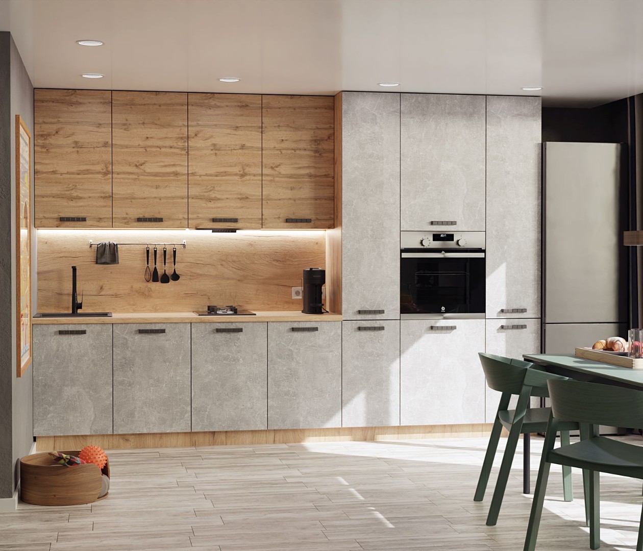Кухонный гарнитур «Пасаденна» с его эффектным, выразительным декором фасадов, имитирующим текстуры дерева и бетона, массивными, оригинальными ручками, а также стилизованными «под дерево» столешницей и корпусом идеально дополнит интерьер, выполненный в ультрапопулярном сегодня стиле Лофт и вместе с тем органично впишется в любимый многими скандинавский стиль. Кроме того, модель легко интегрировать в любую обстановку с акцентом на естественность, натуральность и природные мотивы.