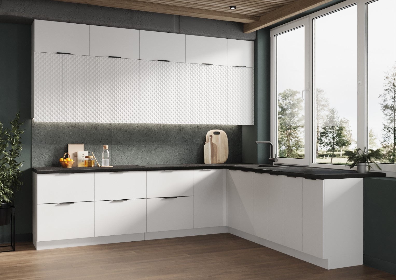 Угловая кухня Каталея является элегантным и функциональным решением для любого интерьера. Фасады кухонного гарнитура выполнены в белом цвете, что придает им чистый и свежий вид. Верхние фасады с фрезеровкой, что добавляет изысканности и стиля. Черная столешница смотрится эффектно и стильно, при этом она легко чистится и устойчива к повреждениям. Выдвижные и распашные ящики обеспечивают максимальную доступность и удобство при работе на кухне. Благодаря этому всегда будет под рукой все необходимое.