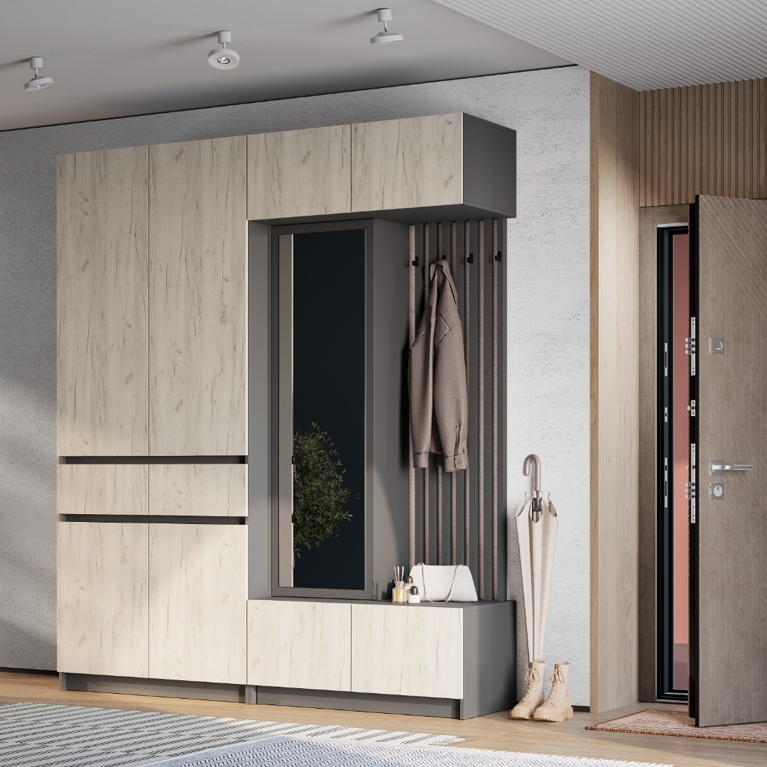 Модульная прихожая Багира – стильное и функциональное решение с лаконичным, элегантным, не перегруженным множеством деталей дизайном, которое гармонично впишется в любой современный интерьер. Сдержанное цветовое исполнение изделий, входящих в состав представленного набора мебели, позволяет с легкостью сочетать данный комплект с другими элементами обстановки.