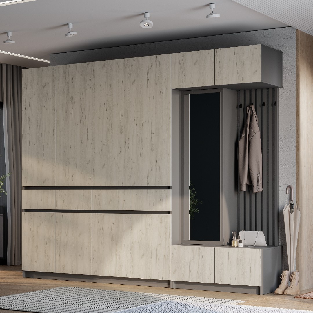 Модульная прихожая Багира – стильное и функциональное решение с лаконичным, элегантным, не перегруженным множеством деталей дизайном, которое гармонично впишется в любой современный интерьер. Сдержанное цветовое исполнение изделий, входящих в состав представленного набора мебели, позволяет с легкостью сочетать данный комплект с другими элементами обстановки.