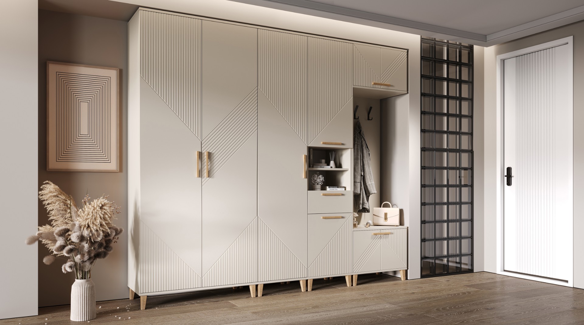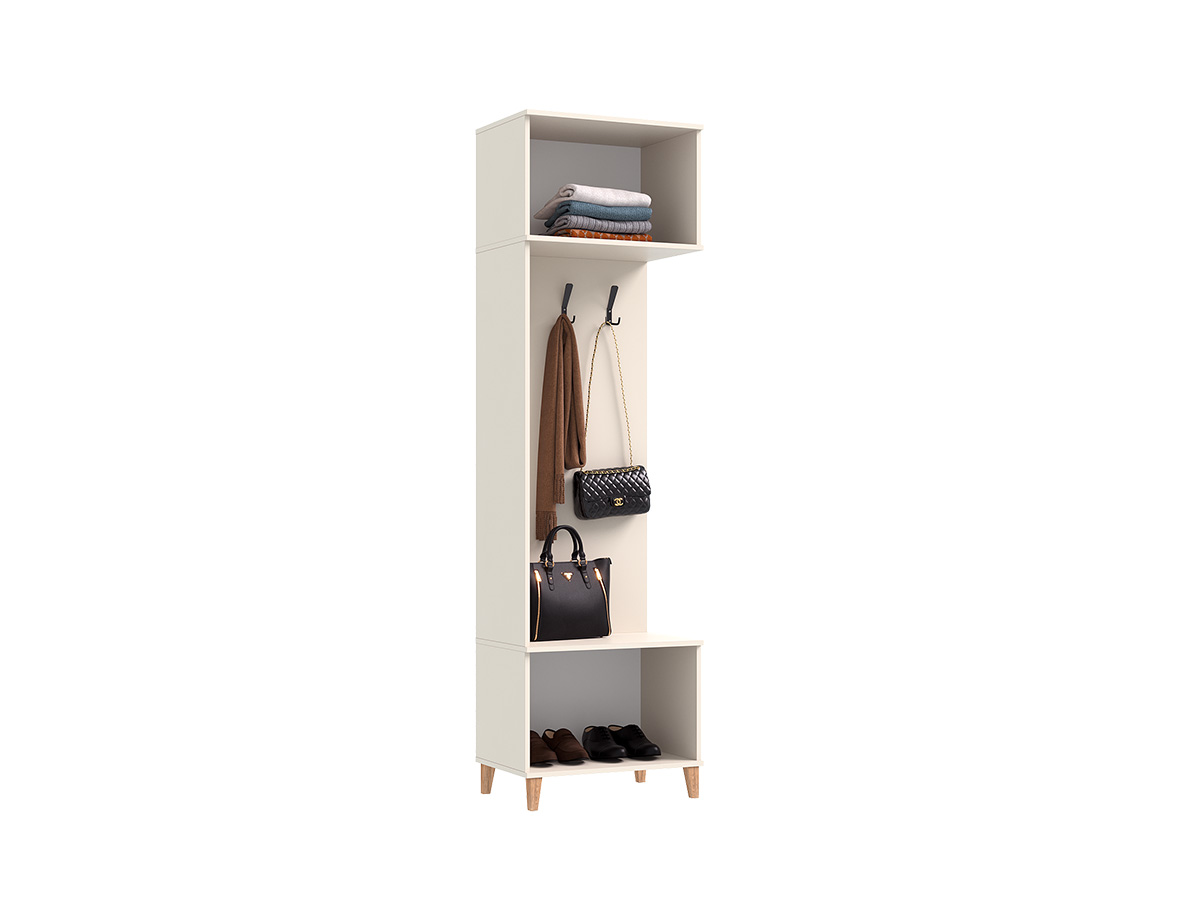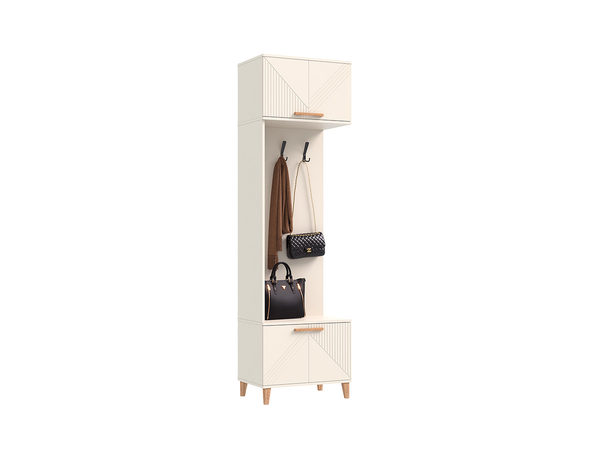 Модульная прихожая «Ирис» - стильное и функциональное решение для входной зоны. Набор включает двухстворчатый шкаф со штангой и полками, закрытый и открытый пеналы, а также шкаф с крючками для верхней одежды. Сдержанное цветовое исполнение предметов комплекта создает в помещении атмосферу спокойствия и гармонии. Фактурные фрезерованные фасады из МДФ дополнены оригинальными ручками из массива дуба.