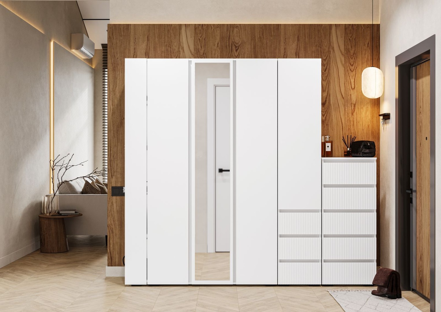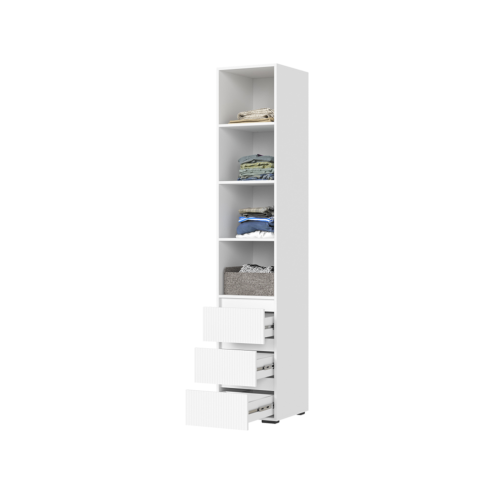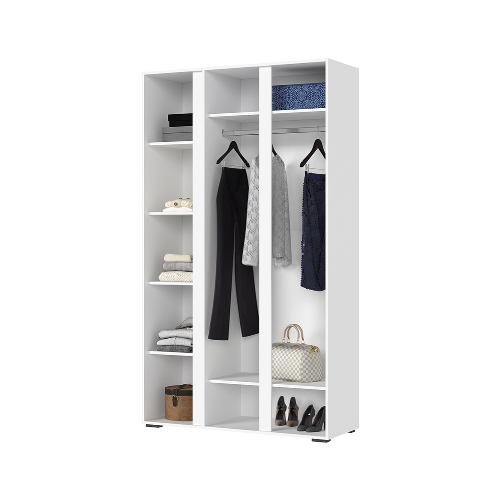 Коллекция "Хелен" преобразит вашу прихожую и придаст ей свежий и стильный вид. Белоснежный фасад и зеркало создают светлую атмосферу, отражая естественное освещение и визуально расширяя пространство. Комплект включает в себя стеллаж с полками, шкаф трехстворчатый с зеркалом, закрытый пенал и комод с выдвижными ящиками.