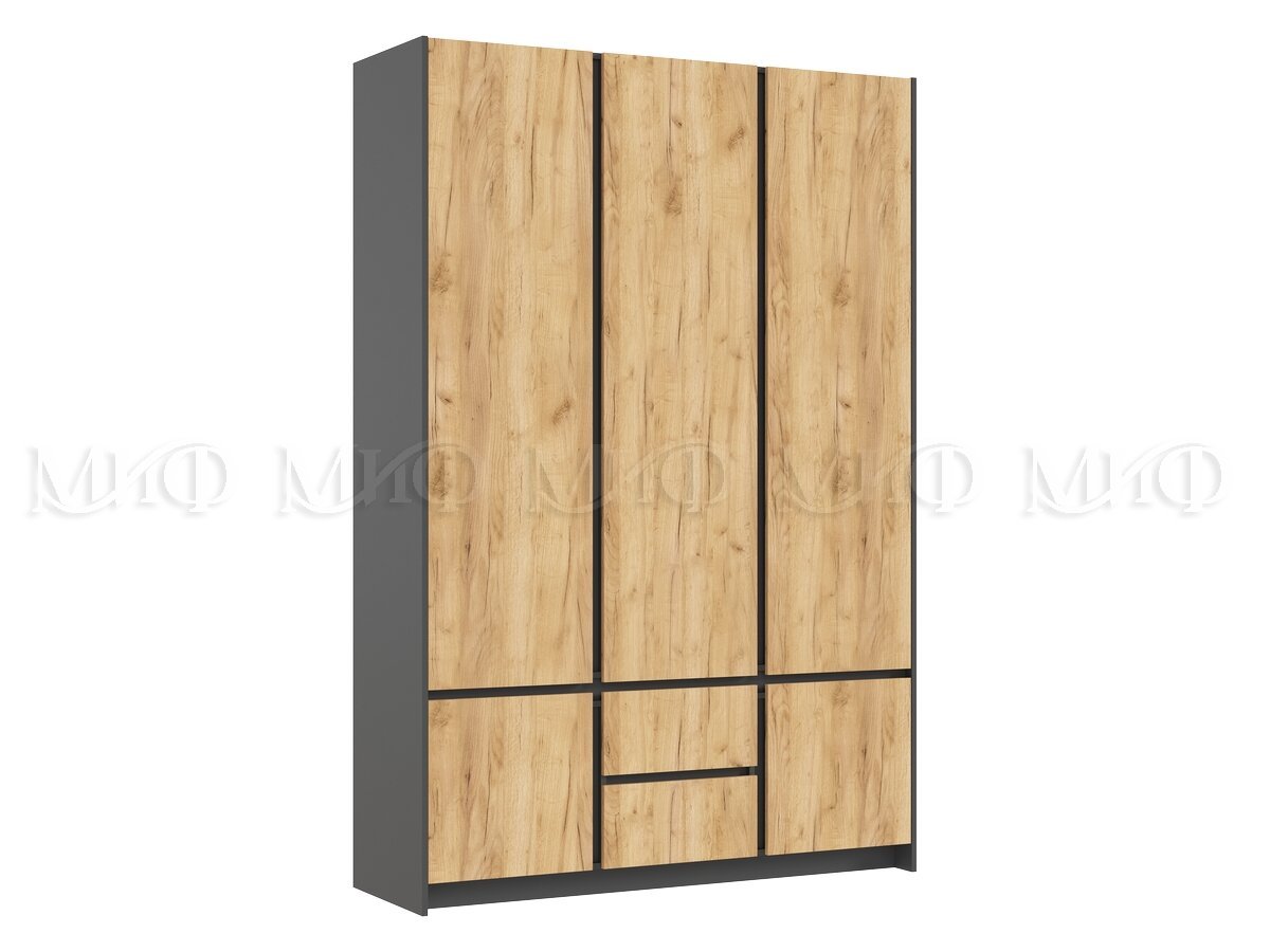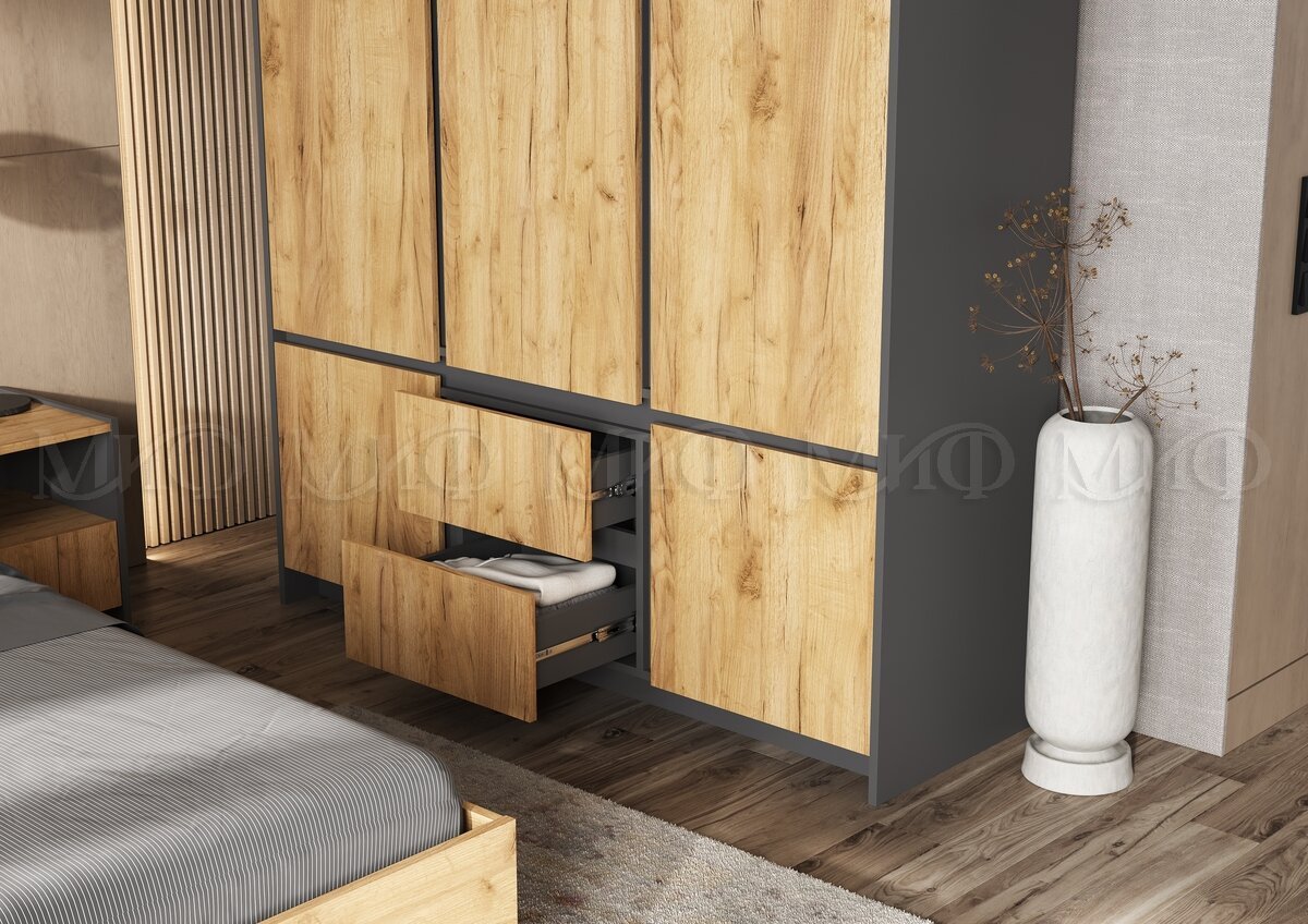 Шкаф «Остин» - прекрасное и минималистичное решение для Вашей гостиной либо спальной комнаты. Шкаф включает в себя отделения со штангами, множество полок и выдвижные ящики на шариковых направляющих, что позволит компактно упорядочить все необходимые вещи. Цветовое сочетание "Дуб Крафт" и "Графит" создаст атмосферу тепла и уюта в Вашем пространстве.