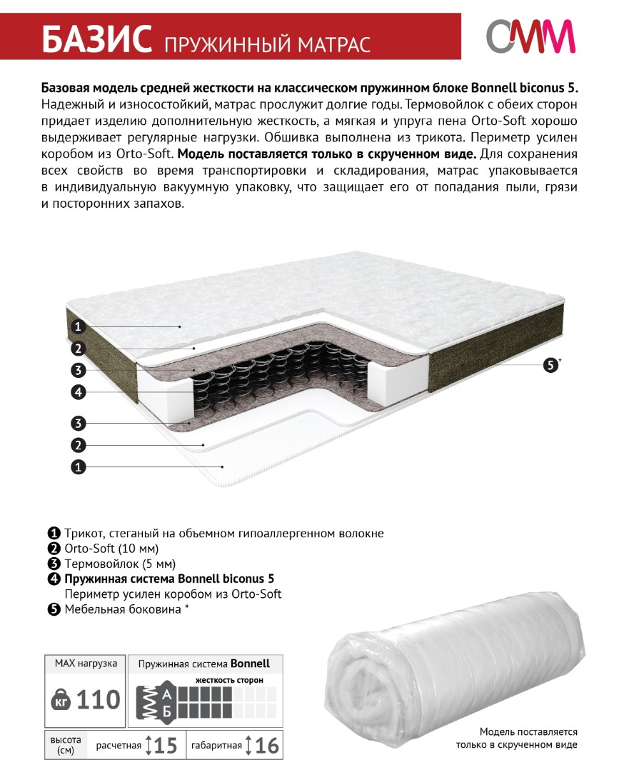 Матрас «Базис» – износостойкая и практичная модель средней жесткости на классическом пружинном блоке Bonnell biconus 5, которая гарантированно прослужит вам долгие годы. Мягкая ортопедическая пена Orto-Soft отлично выдерживает регулярные нагрузки, а слои термовойлока с обеих сторон придают матрасу дополнительную жесткость. Обшивка изделия изготовлена из прочного трикота. В качестве усиления по периметру используется короб из упругой пены Orto-Soft. Матрас упакован в индивидуальную вакуумную упаковку, которая надежно защищает его от любых загрязнений.