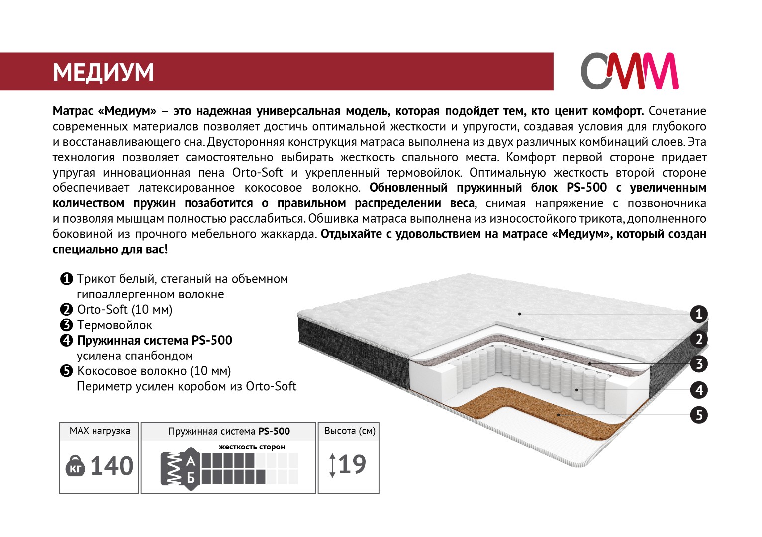 Матрас «Медиум» – отличный выбор для ценителей максимального комфорта. Модель – двухсторонняя, что позволяет самостоятельно выбирать жесткость спального места. Упругость одной стороне обеспечивает инновационная ортопедическая пена Orto-Soft и термовойлок. Оптимальную жесткость второй стороне придает латексированное кокосовое волокно. Такая комбинация современных материалов позволяет достичь необходимого уровня жесткости и упругости, создавая условия для здорового сна. Обновленный пружинный блок PS-500 с увеличенным количеством пружин обеспечивает правильное распределение веса, снимая напряжение с позвоночника и позволяя мышцам расслабиться. Обшивка матраса изготовлена из прочного трикота и дополнена боковиной из мебельного жаккарда. Матрас «Медиум» превратит ваш отдых в истинное удовольствие!