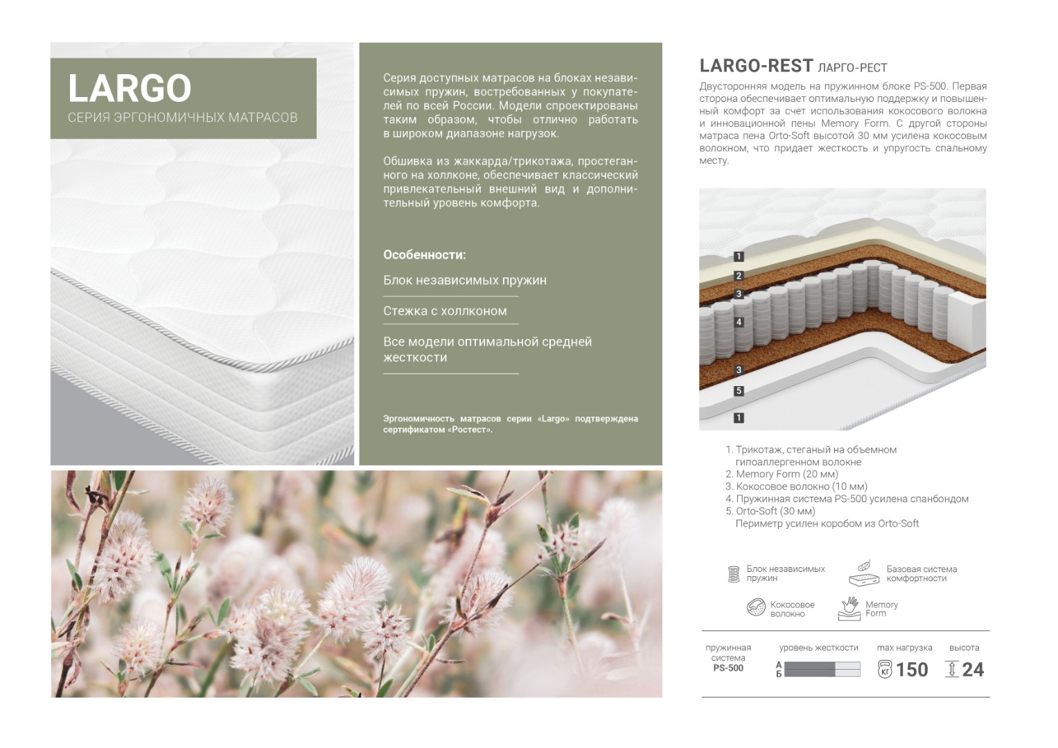 | Настил матраса (нижняя сторона) | Кокосовое волокно 10 мм, Orto-Soft 30 мм |